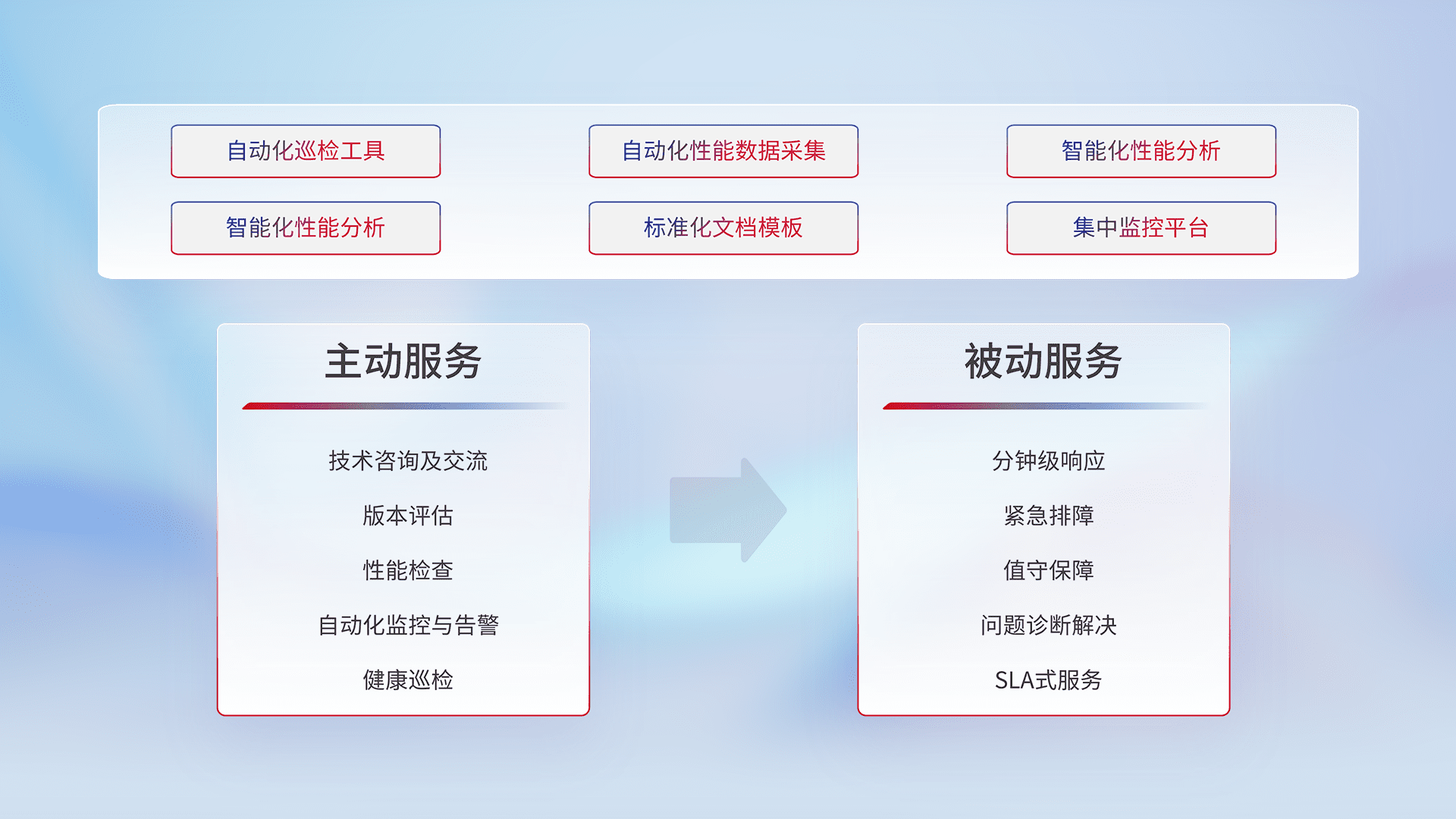 智能化工具和标准化文档,,,保障服务质量,,提供主动服务(包含技术咨询、、、、版本评估、、、性能检查、、、自动化监控与告警、、、健康巡检)和被动服务包含(分钟级响应、、、紧急排障、、、值守保障、、、、问题诊断解决、、SLA服务)。。。。